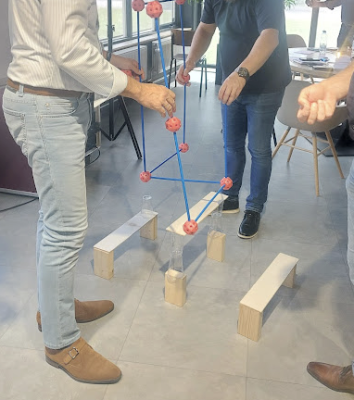 helikopterplatform moesten bouwen. Elk teamlid had een eigen taak. In meerdere rondes bouwden en reflecteerden ze: wat gebeurt er als iedereen z’n eigen ding doet? Waar loopt het spaak? En hoe kunnen we beter samenwerken?